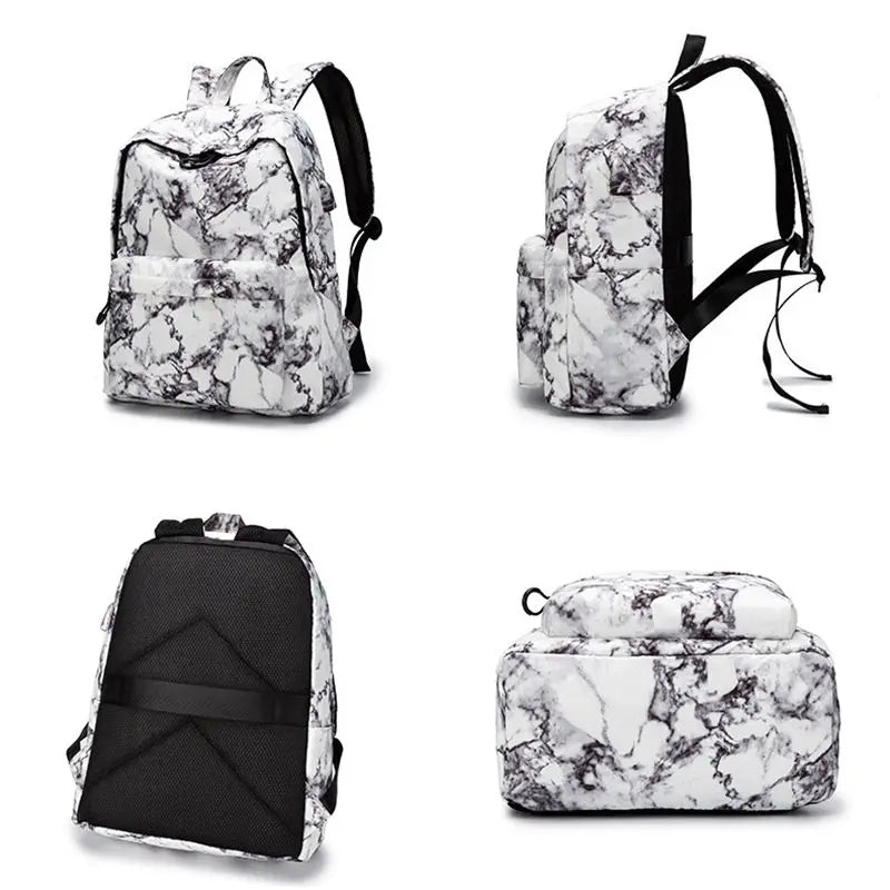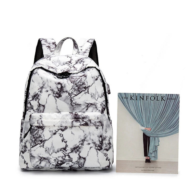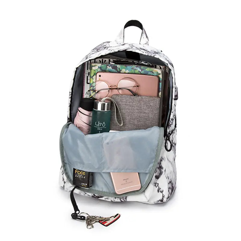 This stylish backpack is perfect for teenagers and girls. It features a marble design, USB port, and ample space for school or travel essentials.