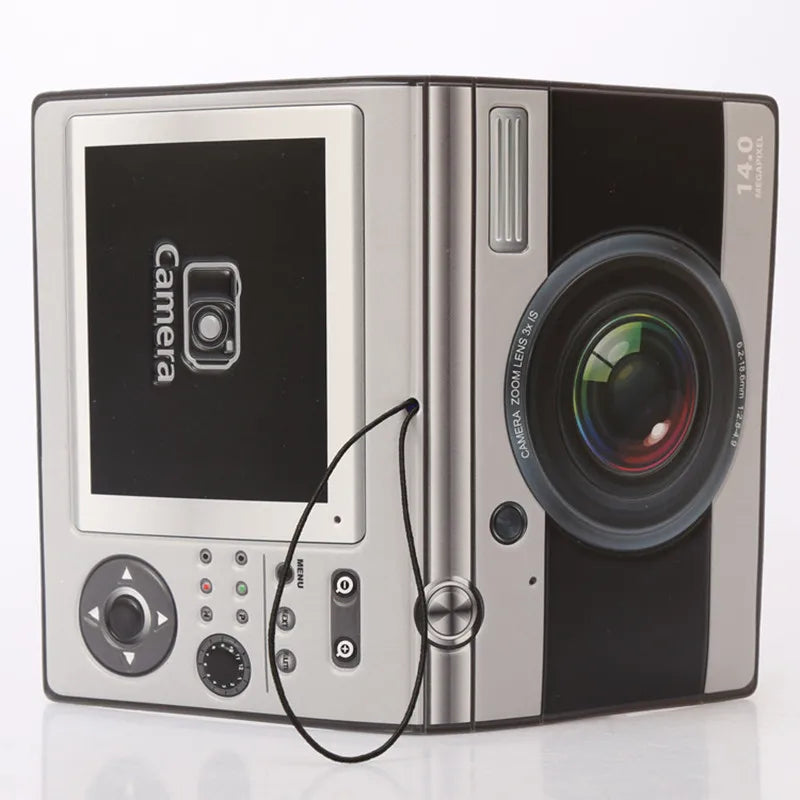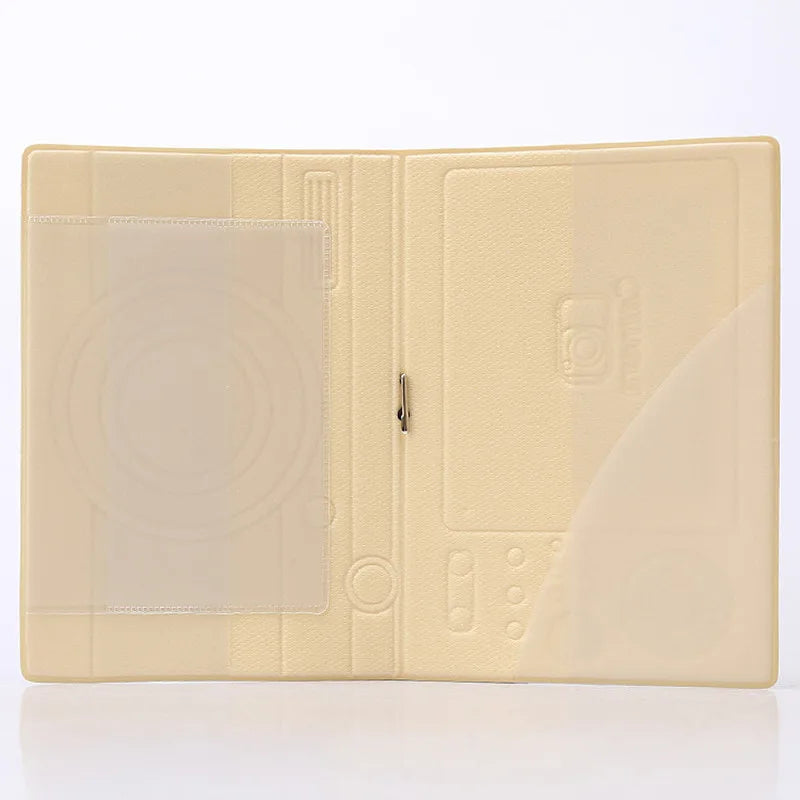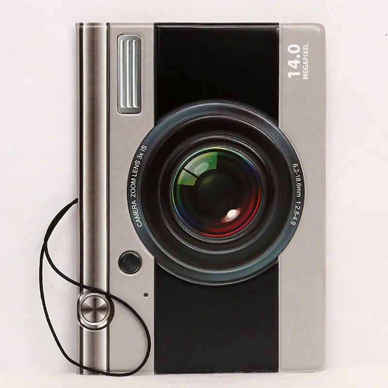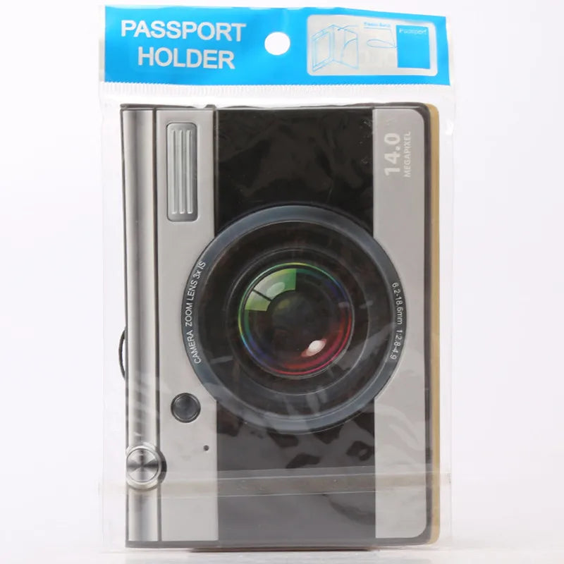 Travel in style with this creative camera passport cover made of durable PVC material. It features a slot for your passport, ID, address, and boarding pass, keeping your essential documents safe and organized.