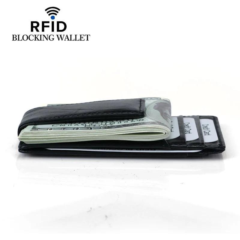 This credit card wallet is made of high-quality first layer cowhide leather with an oil wax finish. It features RFID protection to keep your cards safe. The slim design includes a dollar clip for cash storage.