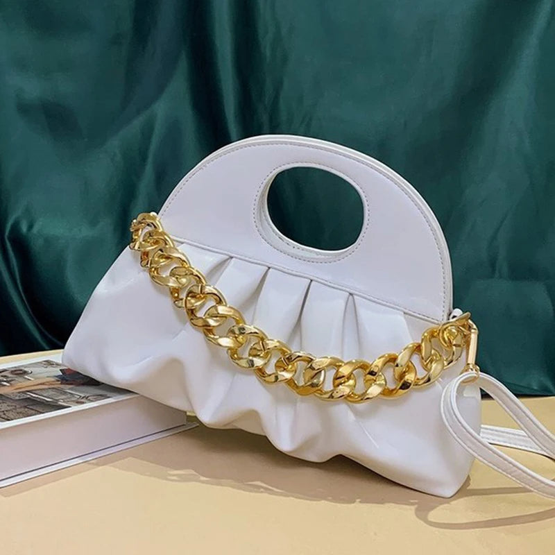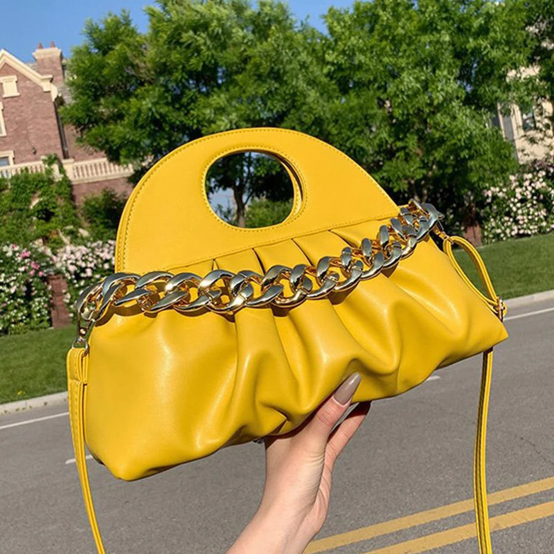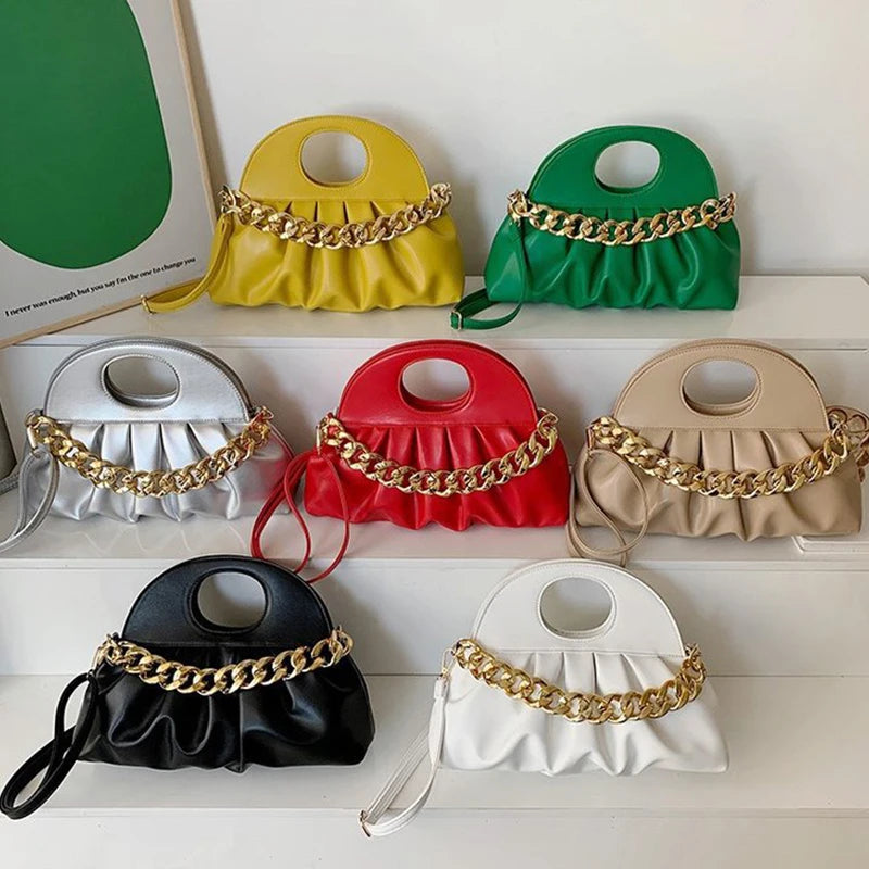 Elevate your style with this chic and versatile hand-held pleated bag featuring a thick chain design. Perfect for any occasion.