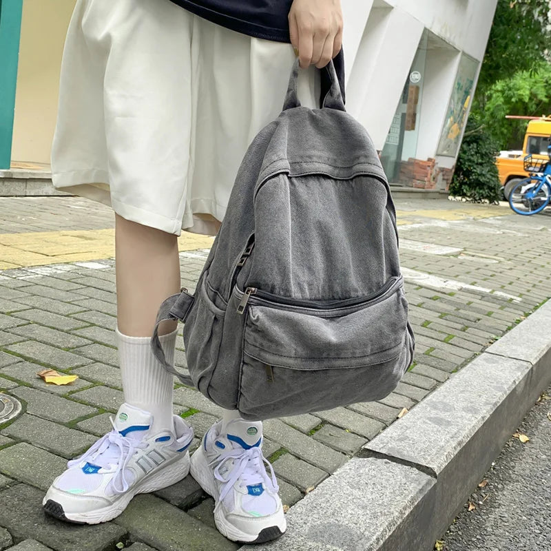 Fashion schoolbag suitable for boys and girls, ideal for leisure travel outings. This versatile gray denim backpack is perfect for both genders.