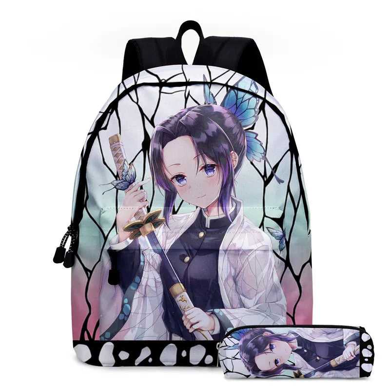 Get these polyester backpacks featuring Kochou Shinobu from the anime Demon Slayer. Perfect for school or travel, includes a pencil bag for added convenience.