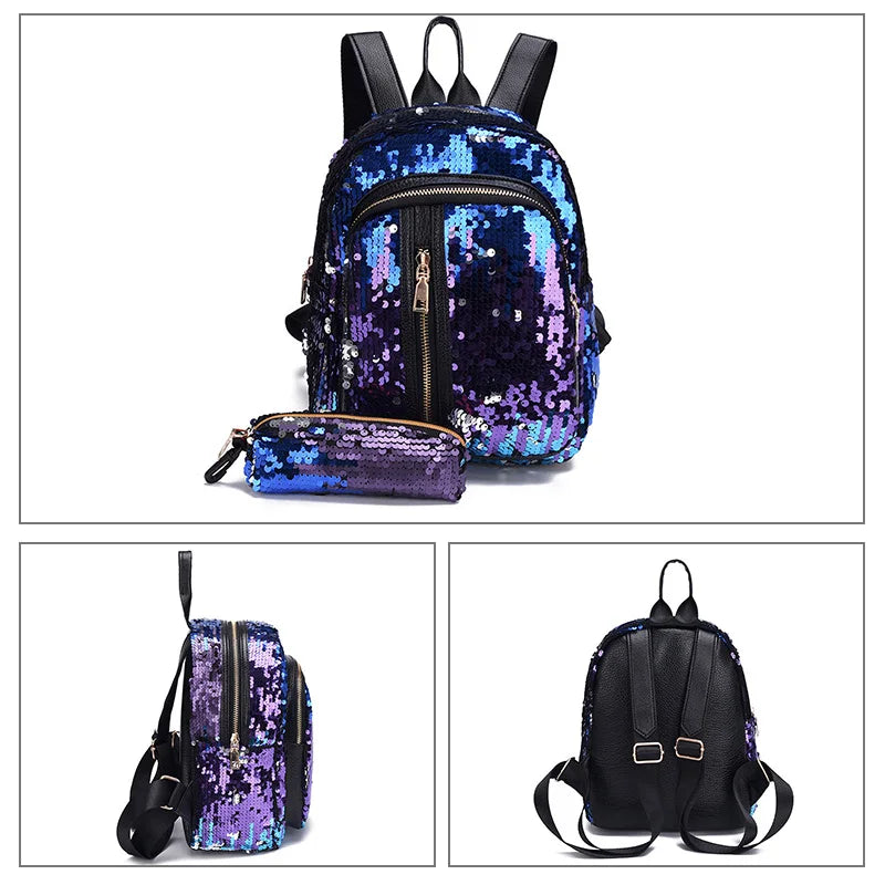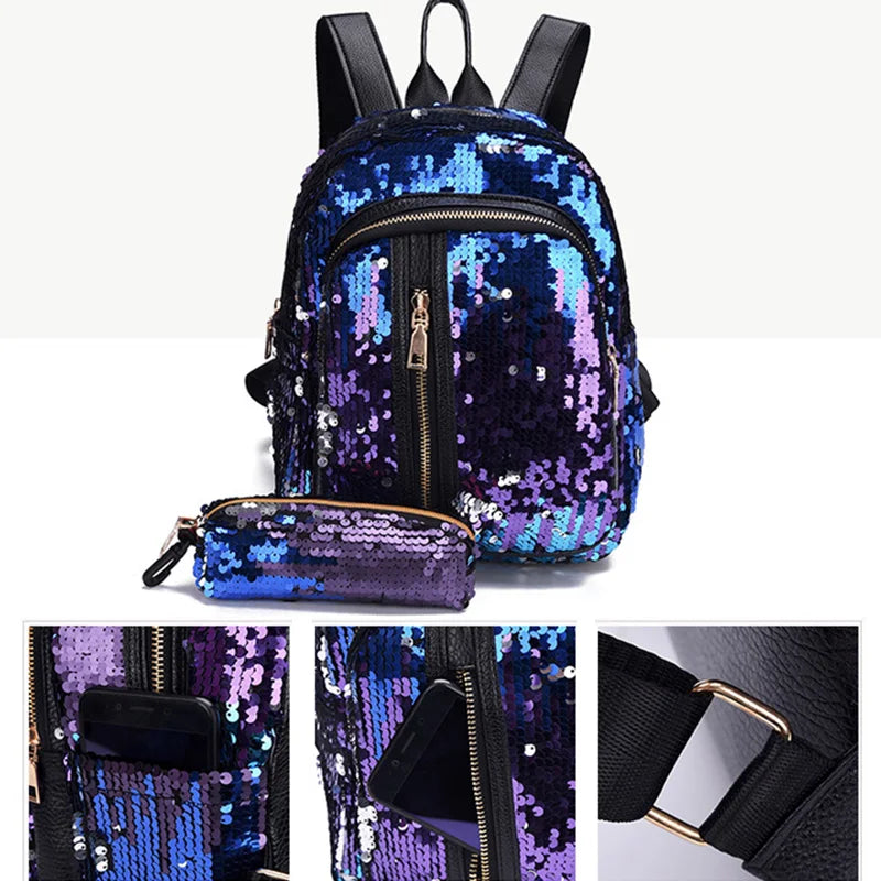 2pcs/set Sequins Women Backpack for Teenage Girl Rucksack School Bag
