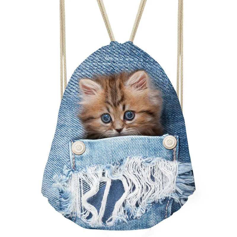 3D Animal Denim Cat Dog Drawstring Bag School Backpack