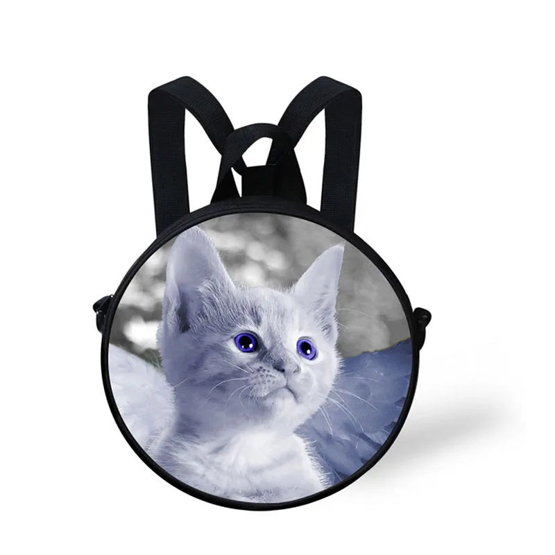 Adorable 3D cat print round bag perfect for kids, featuring adjustable shoulder straps. Ideal for kindergarten or as a small children's backpack.
