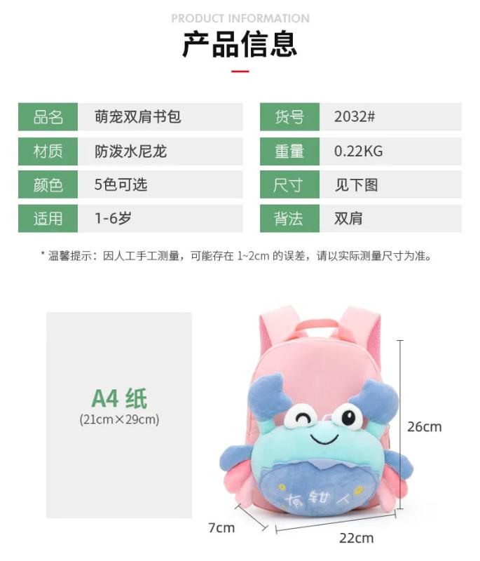 Description:This adorable 3D crab plush toy backpack is perfect for young children. It's ideal for kindergarten or school with a size of 10 inches. Your kid will love carrying their belongings in this fun and vibrant backpack.Features: 3D crab plush toy backpack for kids Ideal for kindergarten or school Size:...