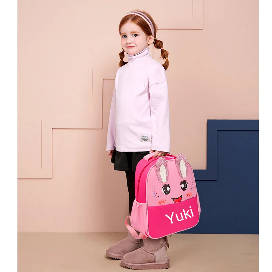 Adorable and personalized toddler backpack featuring a cute 3D rabbit design, perfect for girls aged 2-6 years. Ideal for school, travel, or everyday use.