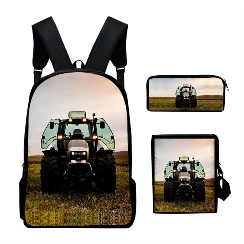 This 3D tractor pattern print backpack is perfect for children to carry to school. It includes a shoulder bag, pencil case, and more.