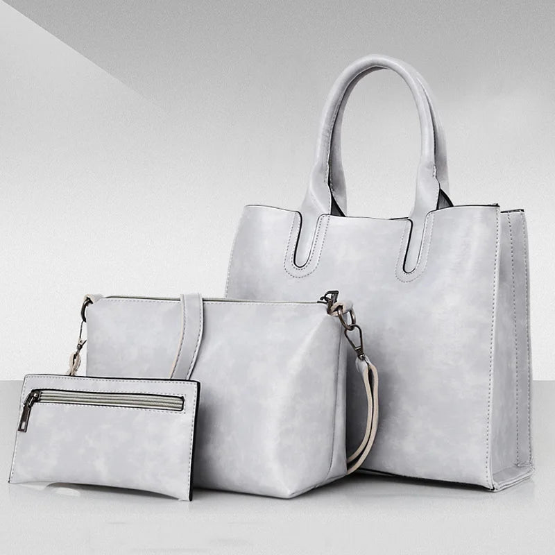 This 3-piece women's bag set includes a handbag, shoulder bag, and wallet, all made of oil wax PU leather. Perfect for daily use or special occasions.