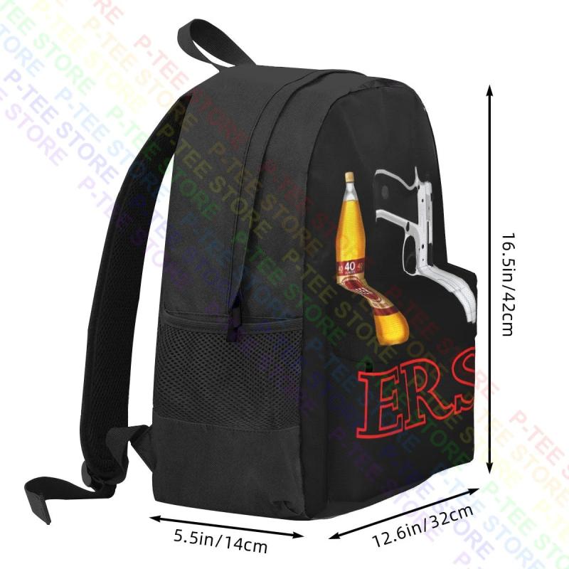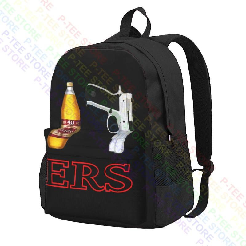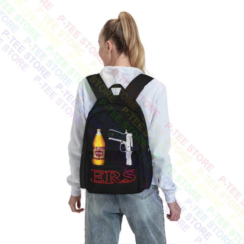 This large capacity backpack features a humorous gun beer sports joke design. Ideal for school, riding, or daily use.
