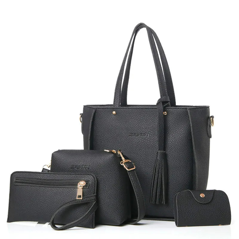 This 4-piece women bag set includes a top-handle bag, big capacity handbag, tassel shoulder bag, and purse. Perfect for daily use or special occasions.