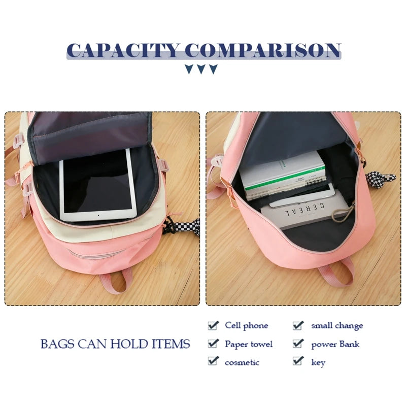 This 5pcs set includes a backpack and various bags for girls. Perfect for school, travel or daily use.