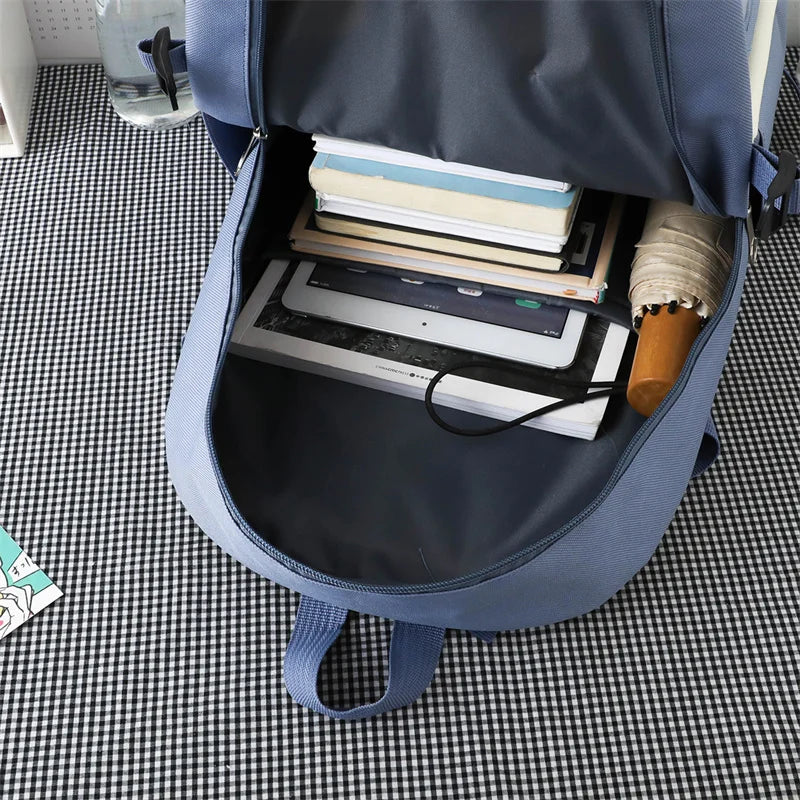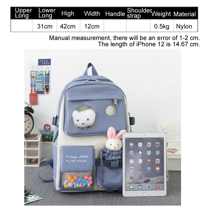 This 5-piece set includes a backpack with multiple pockets designed for a teenage girl student. The cute bear toys add a playful touch to the school backpack.