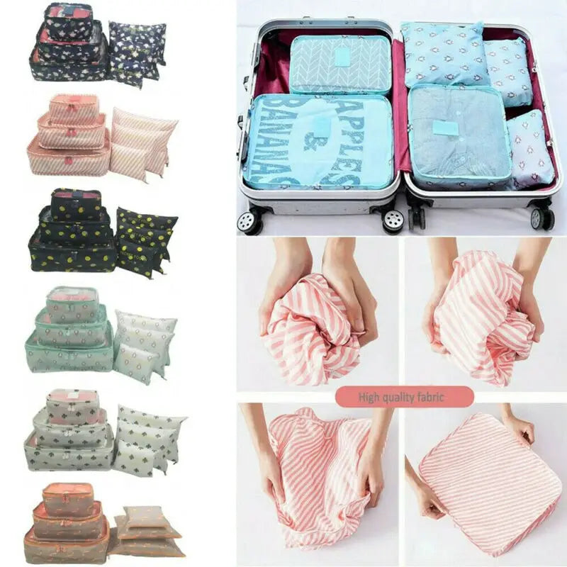 Organize your travel essentials with this set of 6 packing cubes. Perfect for storing clothes, underwear, cosmetics, toiletries, and more. Save space in your luggage and keep your items neatly packed.
