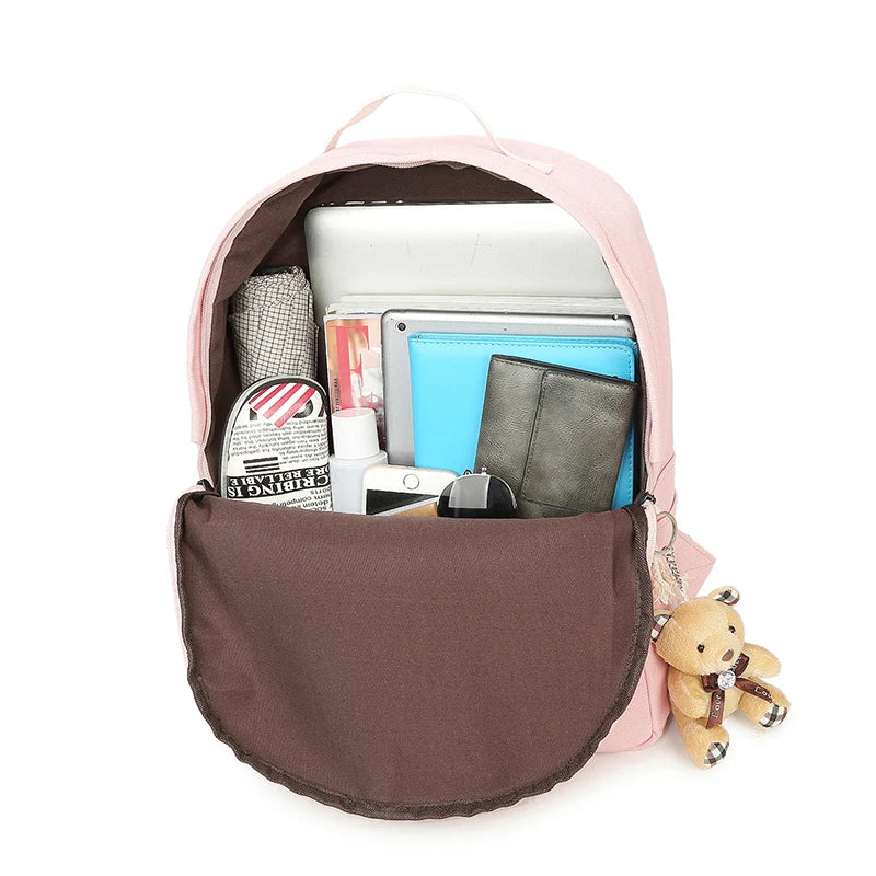 This 6-piece set includes cartoon-printed canvas backpacks, ideal for school. Designed for teenage women students, these bags are spacious and durable. Perfect for carrying books, supplies, and more.