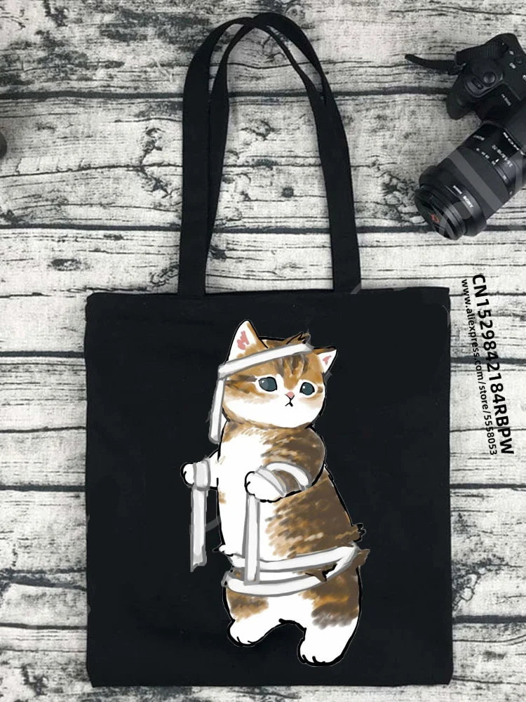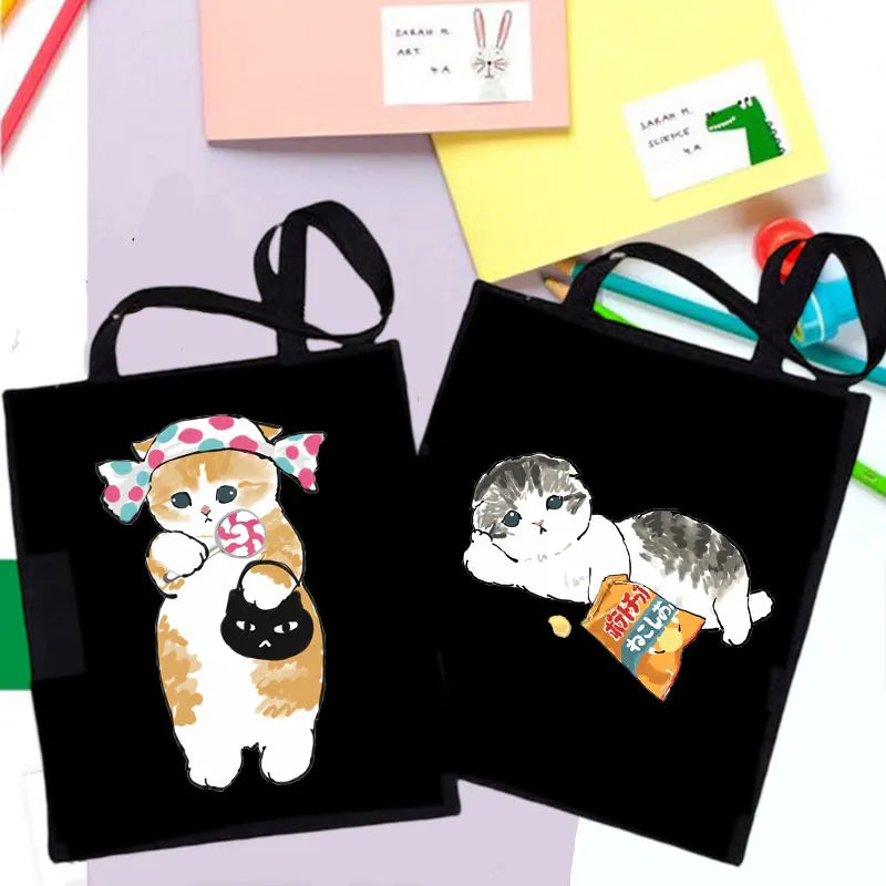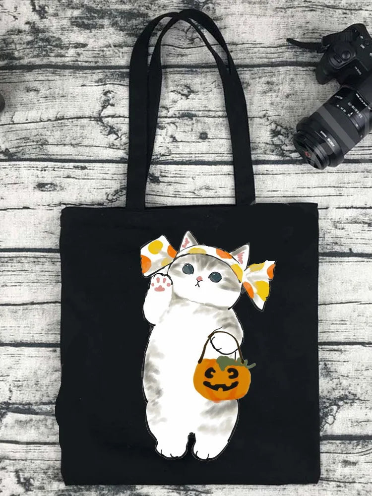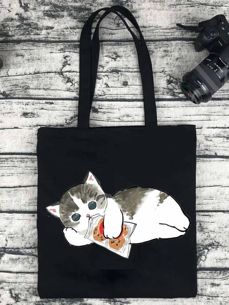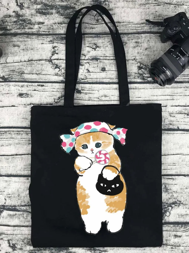 This classic vintage tote bag is perfect for daily use or shopping. Made from cotton canvas, it features a cute cat design. Ideal for Harajuku style enthusiasts.