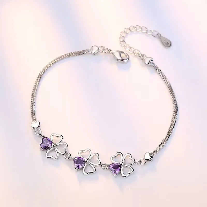 925 Silver Bracelet Purple Wedding Clover CZ 17CM+4CM