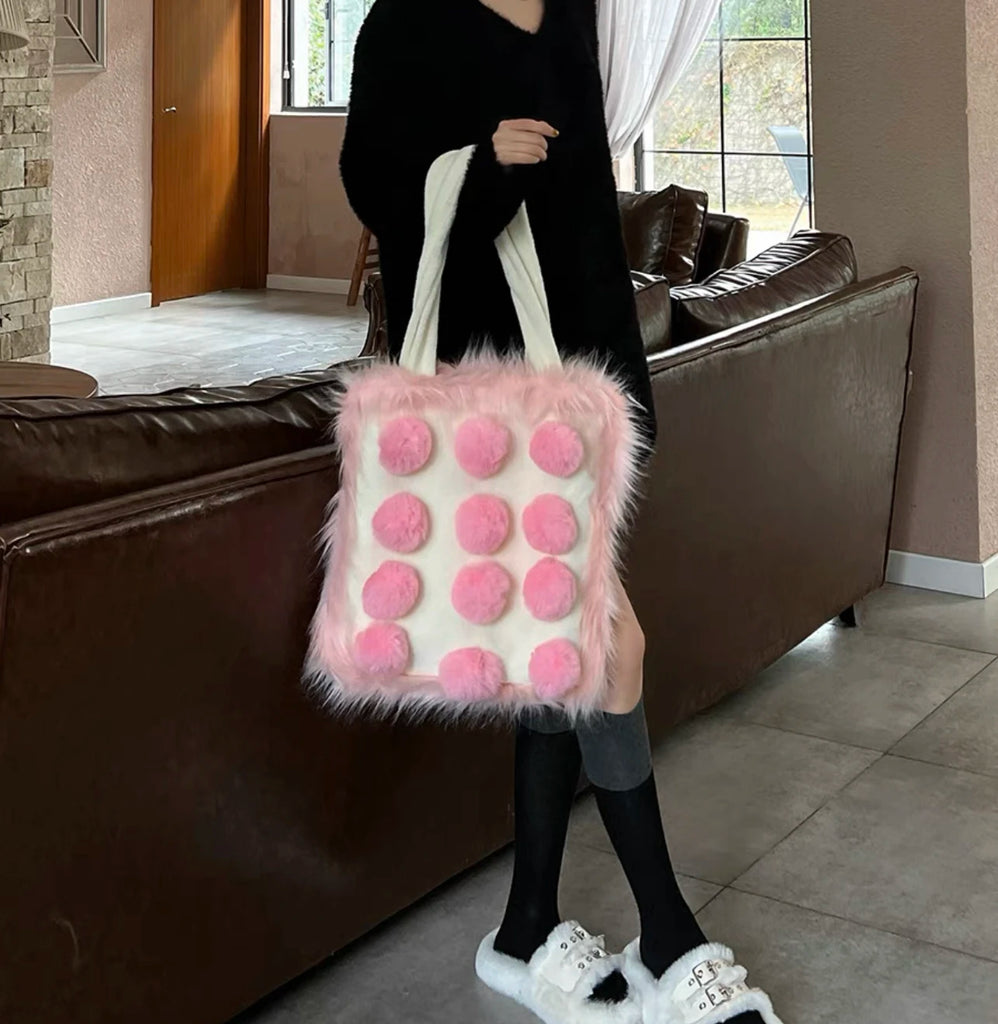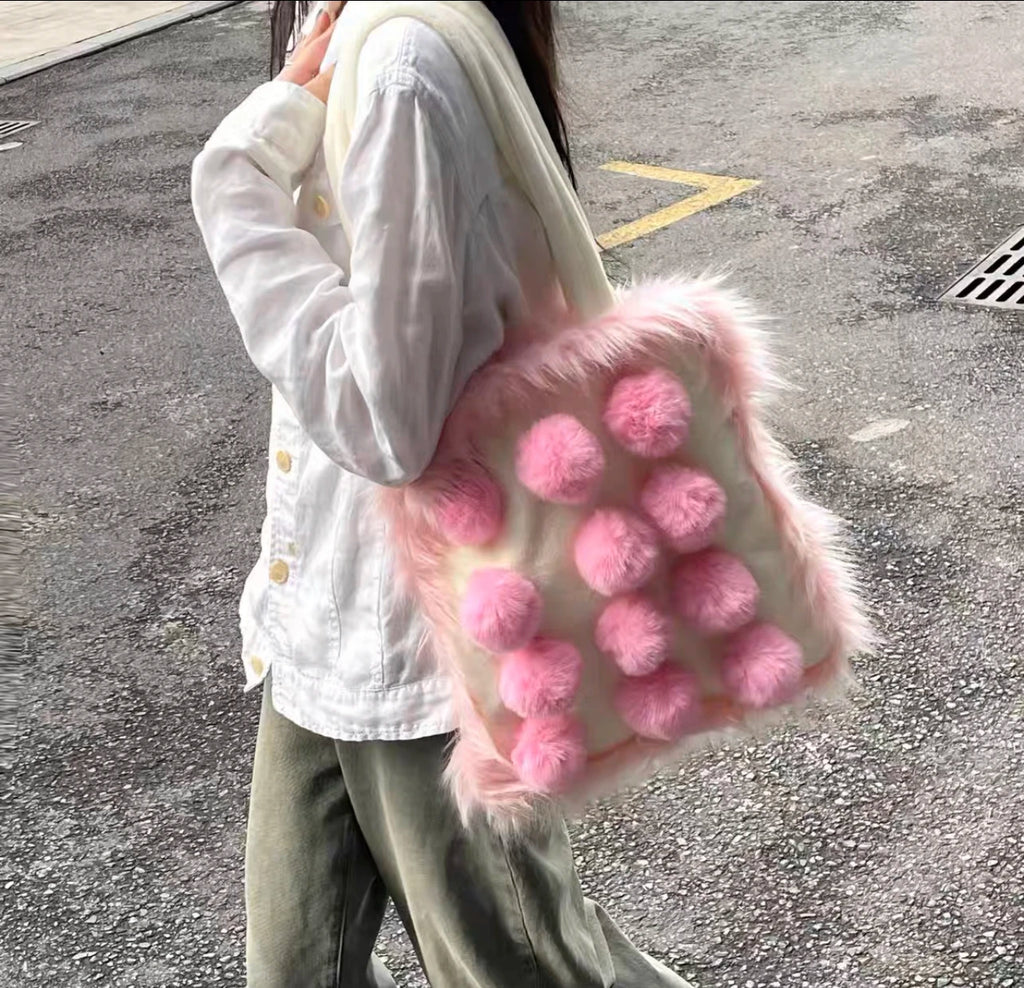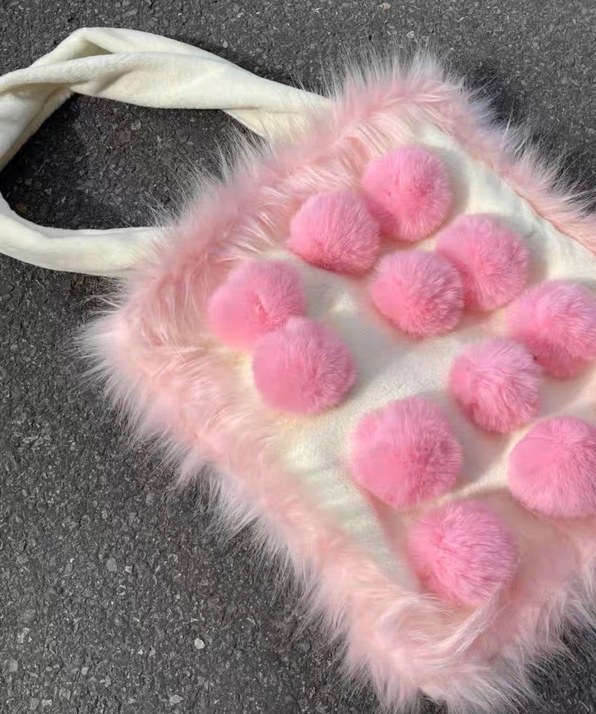 Aboutlee Pink Furry Tot Bag Large Capacity Soft Fur Ball Decorated Handbag Women