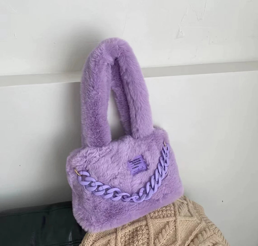Stay stylish with this soft purple furry handbag featuring a chain decoration. Perfect accessory for women.