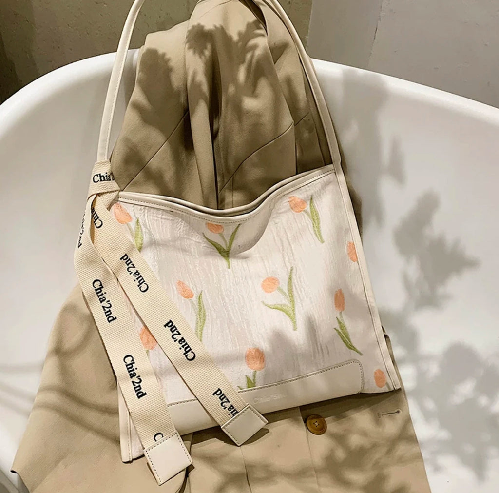 Stay stylish and organized with the Aboutlee Tulip Pattern Shoulder Bag. This large capacity bag is perfect for everyday use, offering a tender and flutter touch to your outfit.