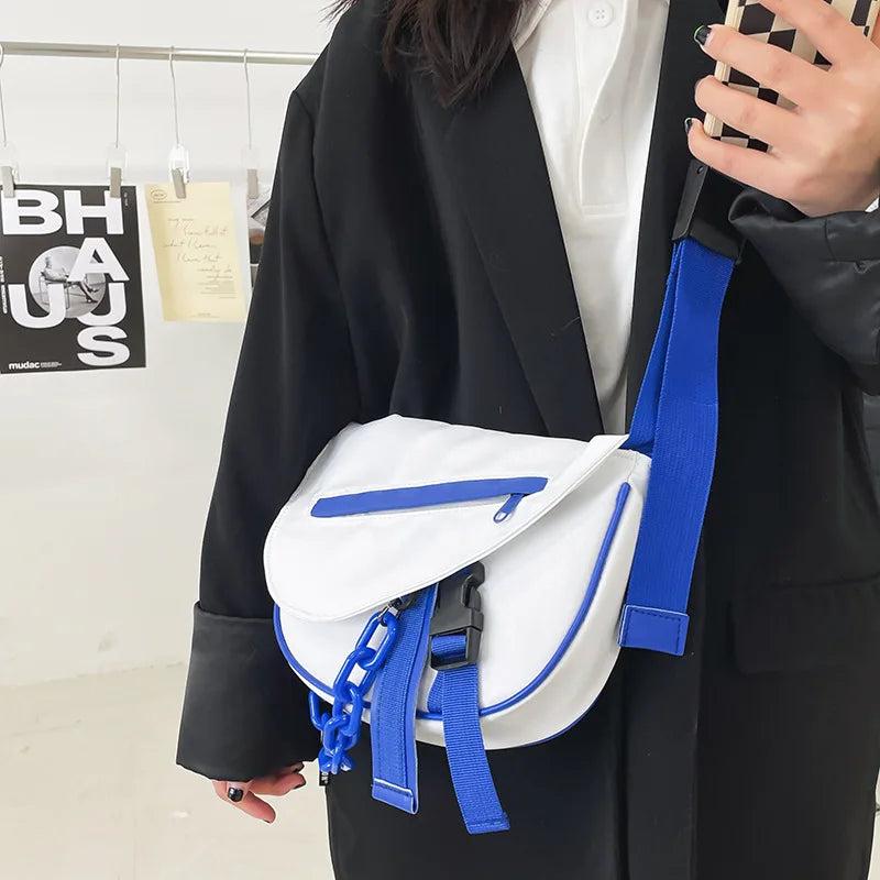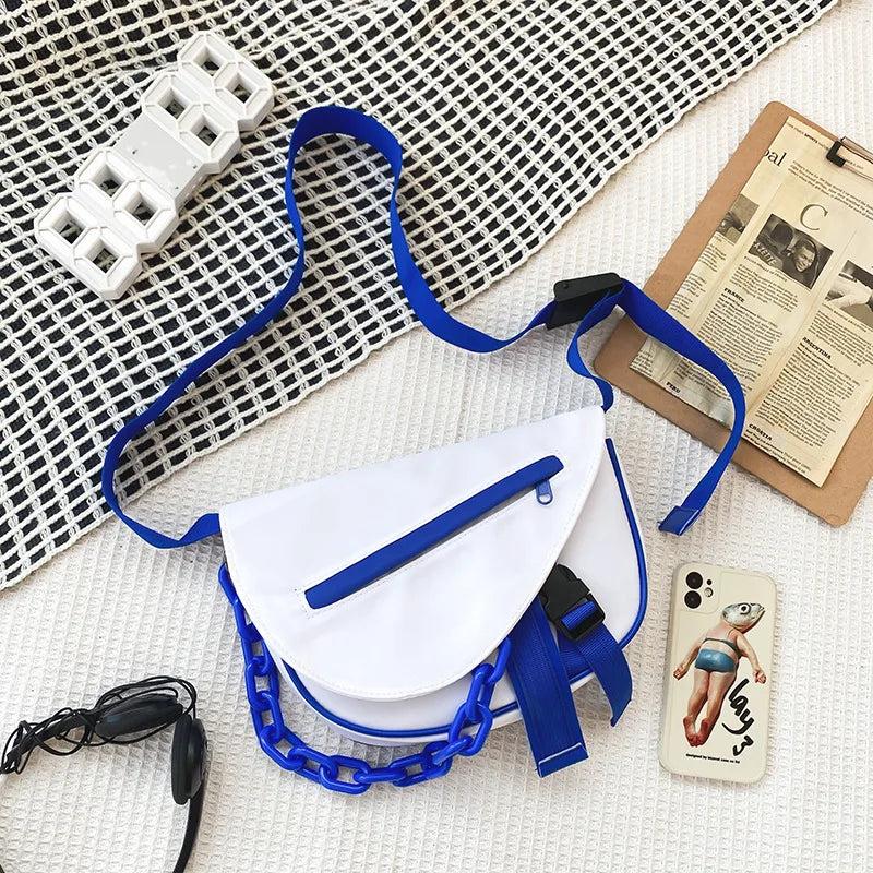 This trendy crossbody bag features a stylish patchwork pattern and is designed with an acrylic chain detail. It's perfect for keeping your essentials organized while adding a chic touch to your outfit.