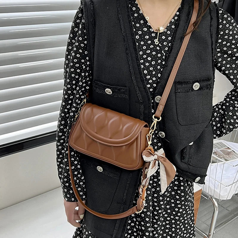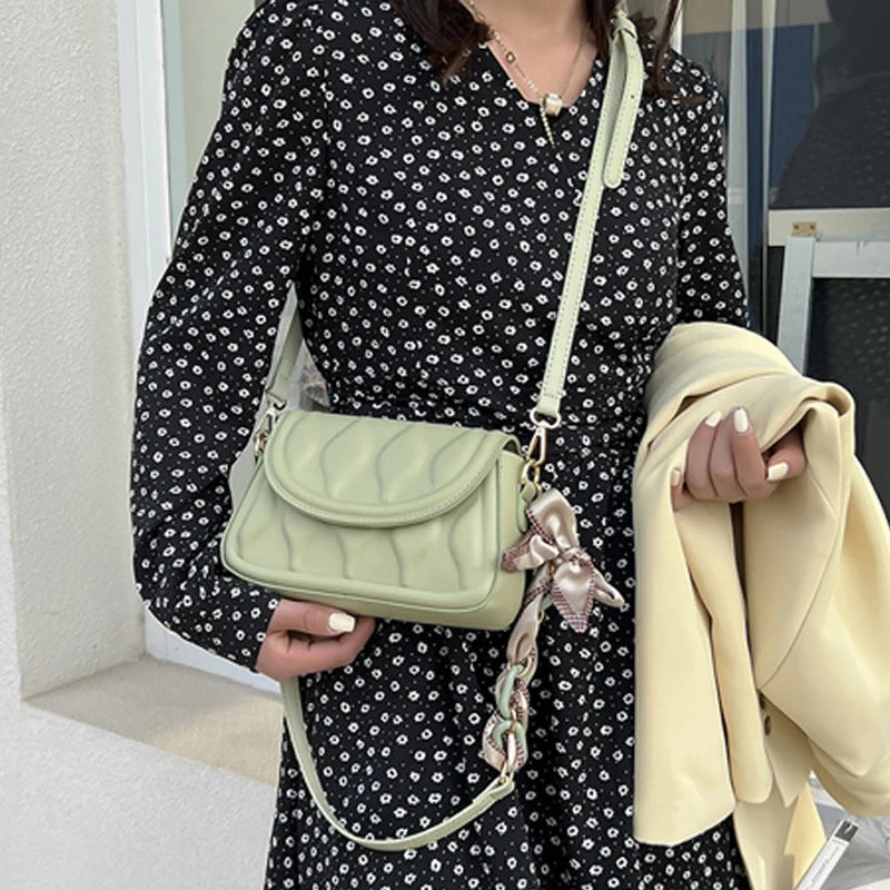 Elevate your style with this chic and versatile shoulder bag. Featuring an acrylic chain strap and silk scarves, this purse is perfect for any casual or formal occasion.
