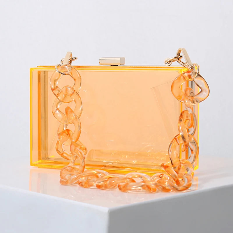 Upgrade your style with this chic orange clutch purse that can also be worn as a crossbody bag. Made from clear acrylic material, this high-quality handbag is a versatile accessory that adds a pop of color to any outfit.