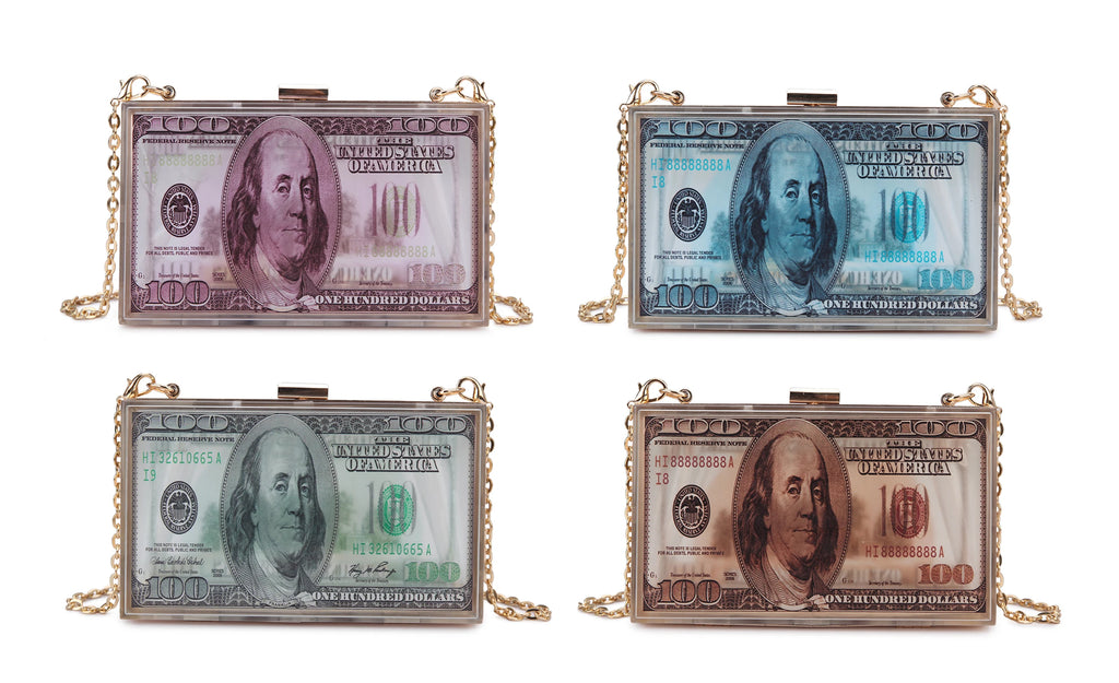 This small crossbody bag is perfect for carrying your money in style. It features a transparent acrylic design that is sure to turn heads.