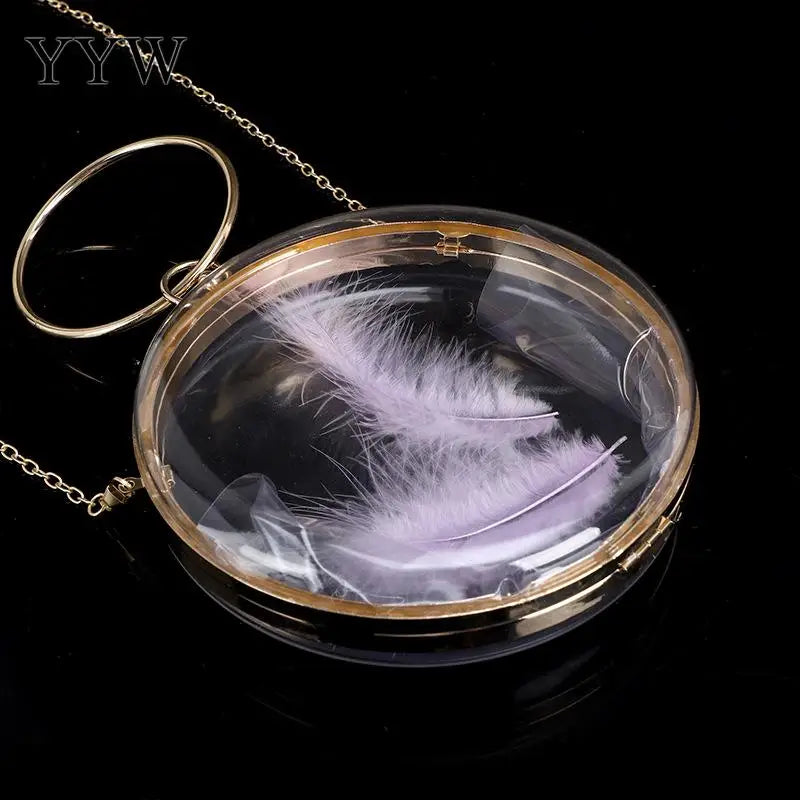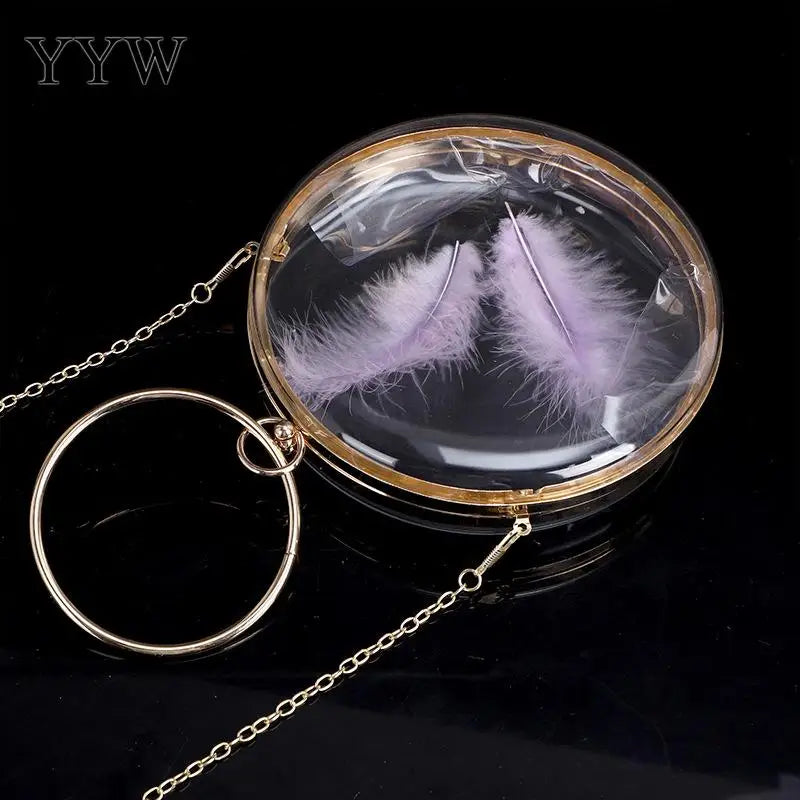 This stunning transparent acrylic evening bag features feather detailing, making it the perfect accessory for parties and special occasions. The round clutch design adds a touch of elegance to any outfit.