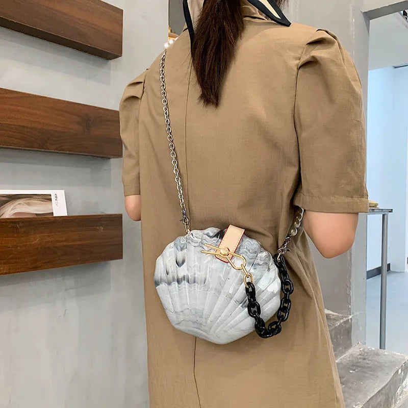 Elegant and stylish acrylic shell bag with a chain strap for a sophisticated look.