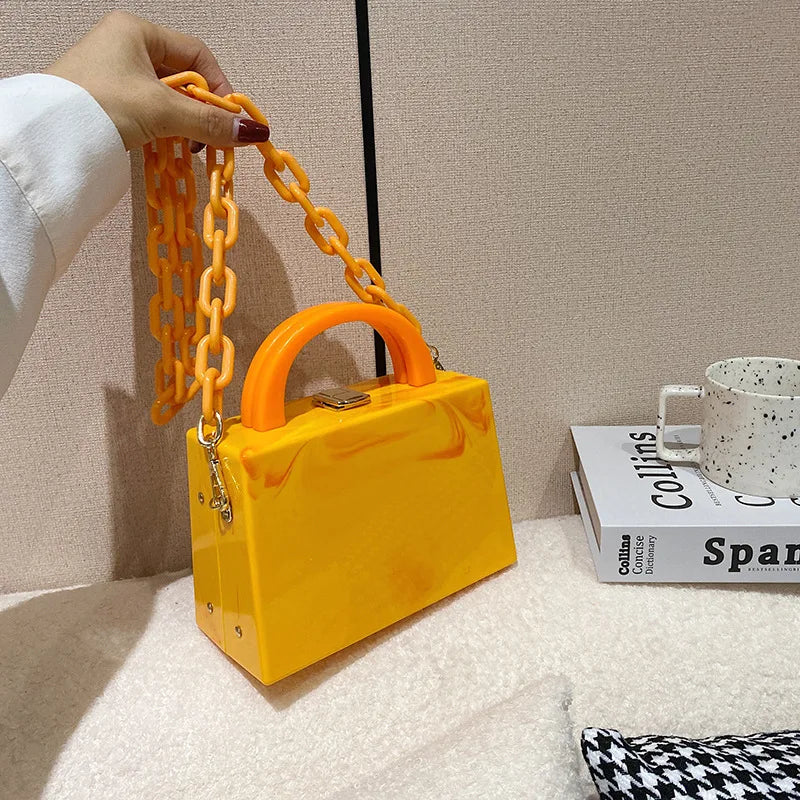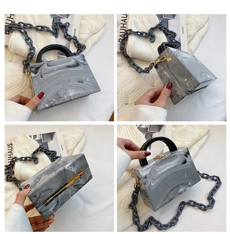 Elegant and stylish acrylic box chain bag for women, perfect for parties and evening events.