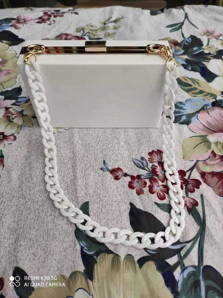 This acrylic transparent clutch bag is perfect for evening events. It comes with a chain strap for easy carrying and adds a touch of elegance to your outfit.