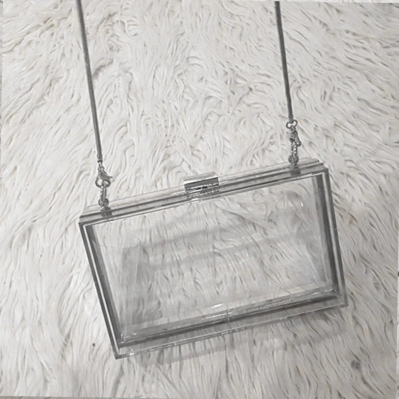 This elegant silver clutch is perfect for weddings, parties, or evening events. It features a hard acrylic construction with a transparent design and a chain strap for easy carrying.