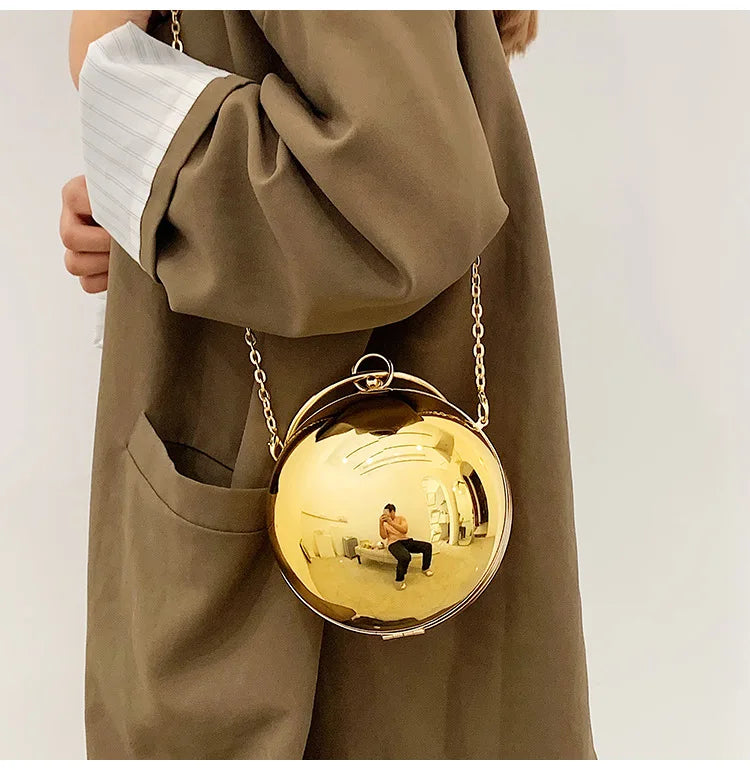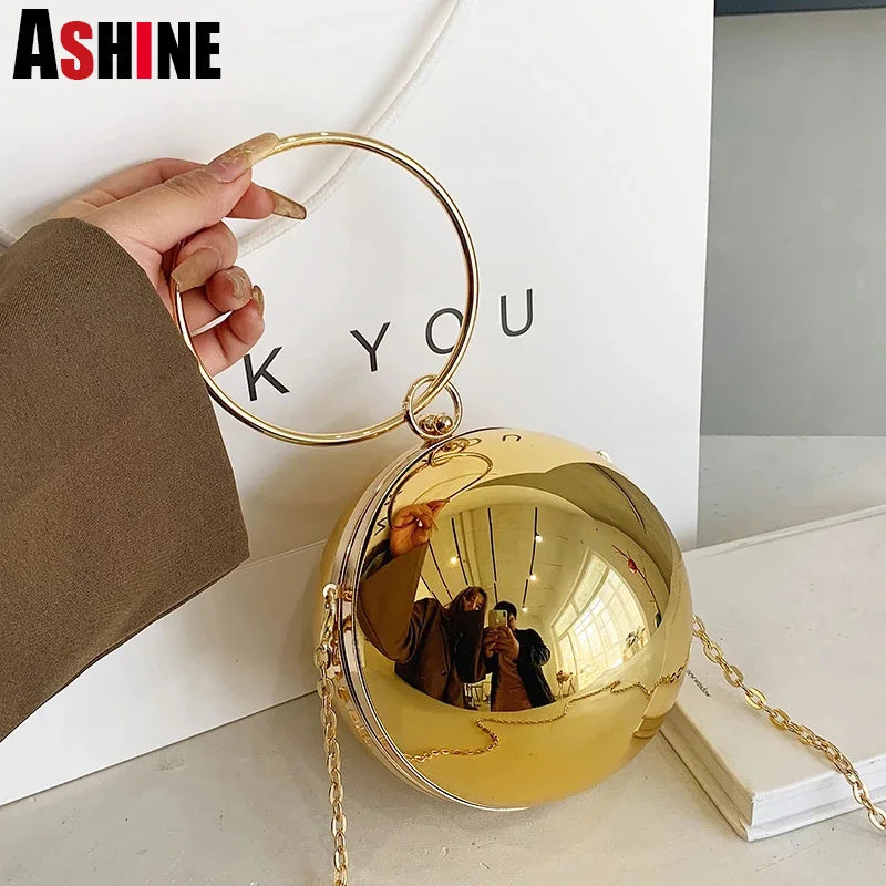 This stylish ball shape evening bag features a round ring handle and a wrist strap, making it perfect for parties. It is made of durable acrylic material and has a mini size for carrying essentials.