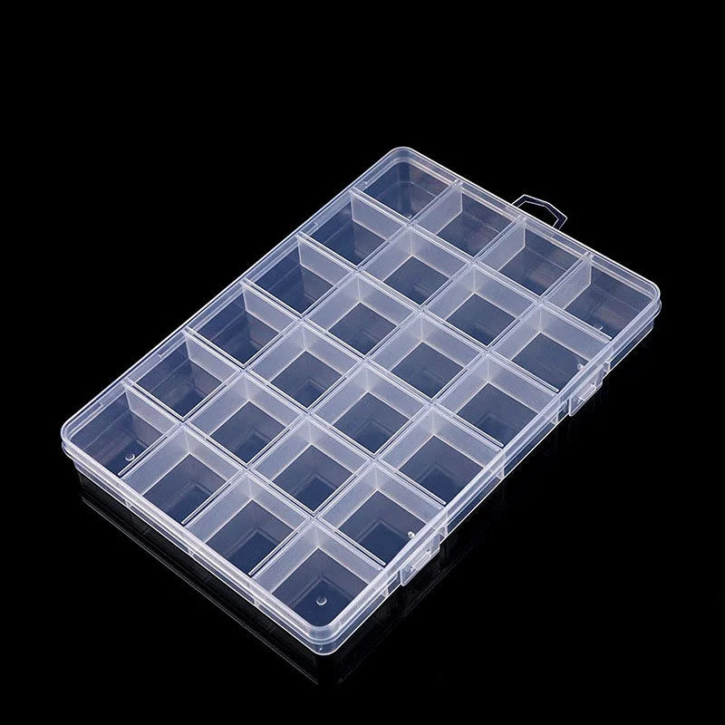 Keep your beads and earrings neatly organized with this adjustable plastic jewelry box. The compartments can be customized to fit different sizes of beads or earrings.