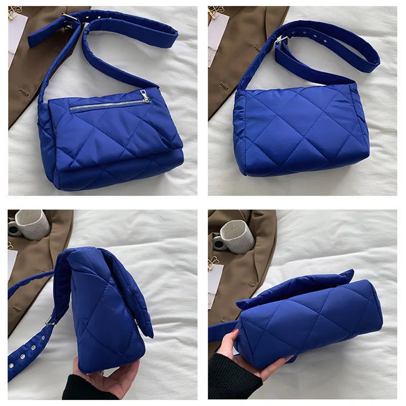 Stay stylish with this casual shoulder bag made of nylon and down cotton. It features an adjustable strap and flap closure, perfect for everyday use.