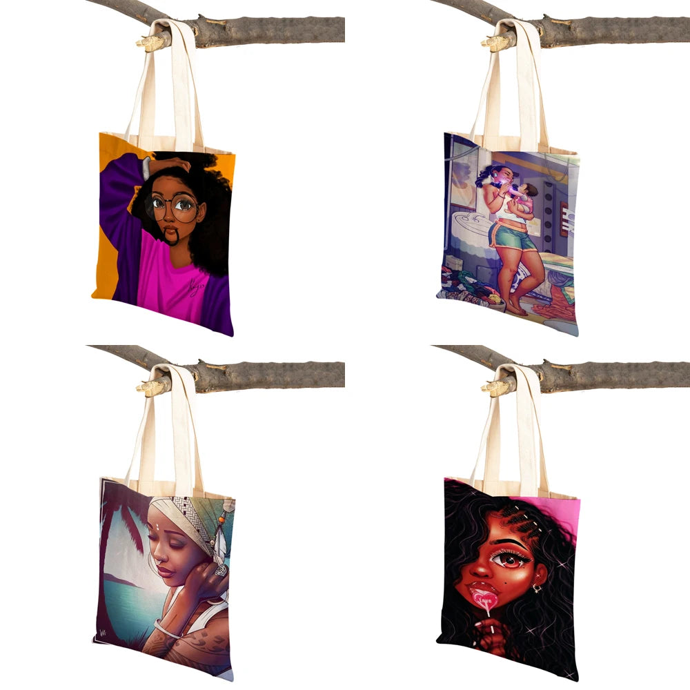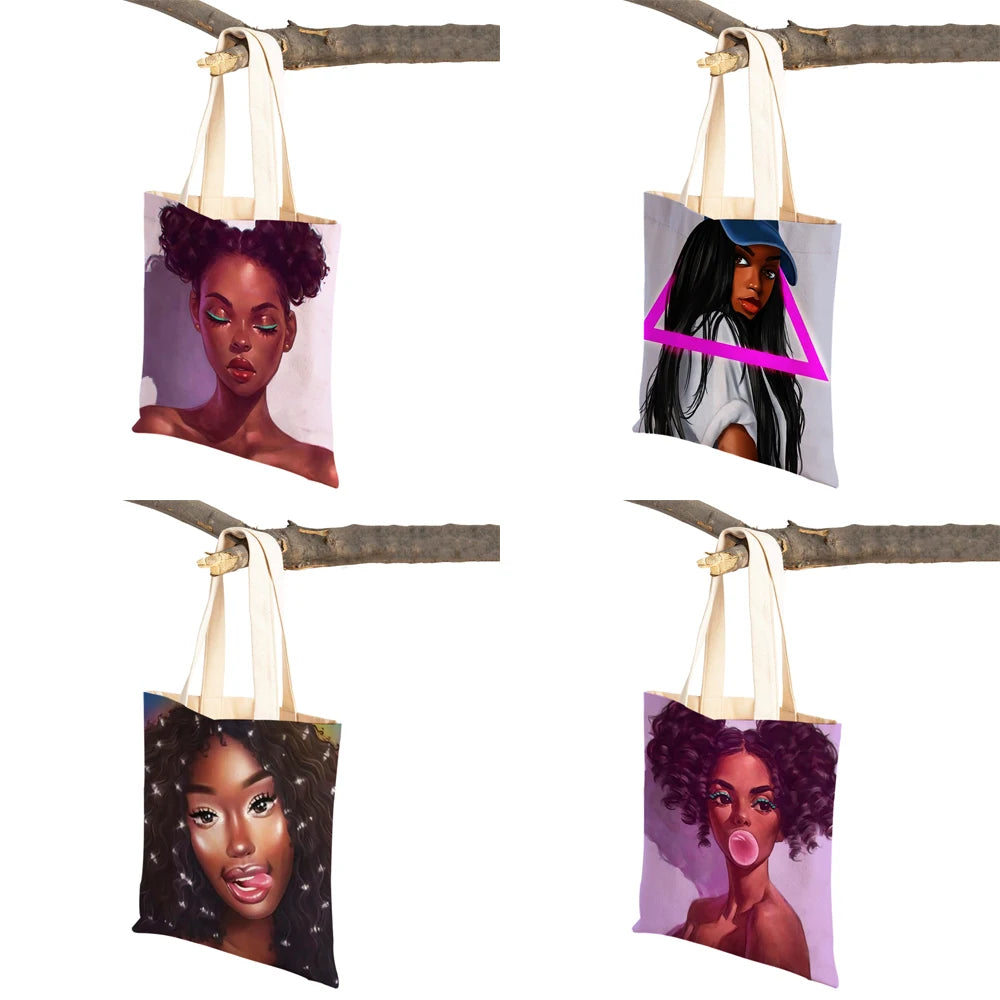 This reusable canvas tote features a double-sided print of a stylish African girl design. Perfect for casual shopping and everyday use.