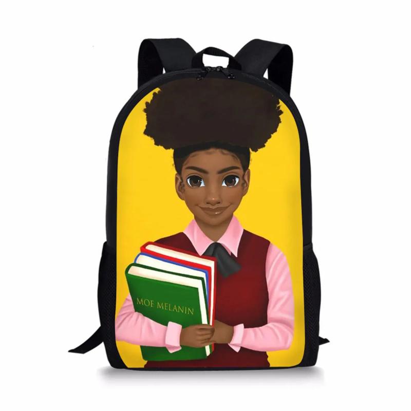 This stylish schoolbag features a unique African girl style print. It includes a pencil bag and lunch bag, perfect for students.