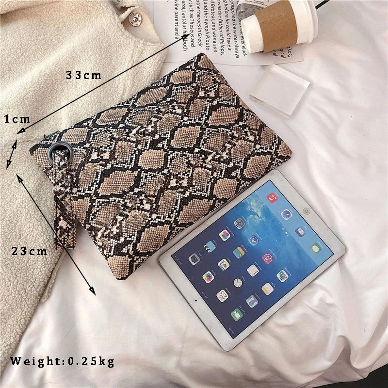 Elevate your style with this elegant clutch bag featuring a snake pattern. Perfect for parties and evening events.
