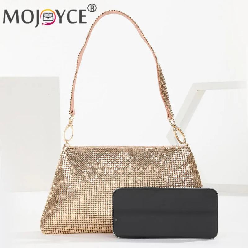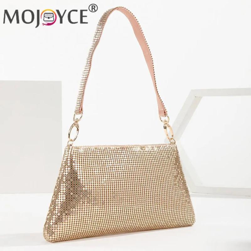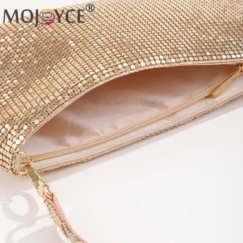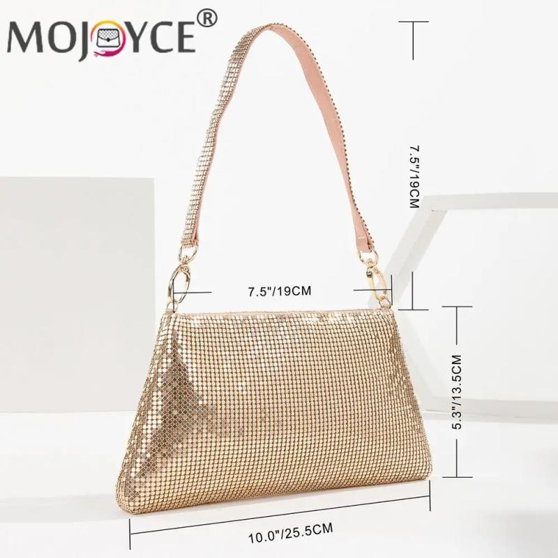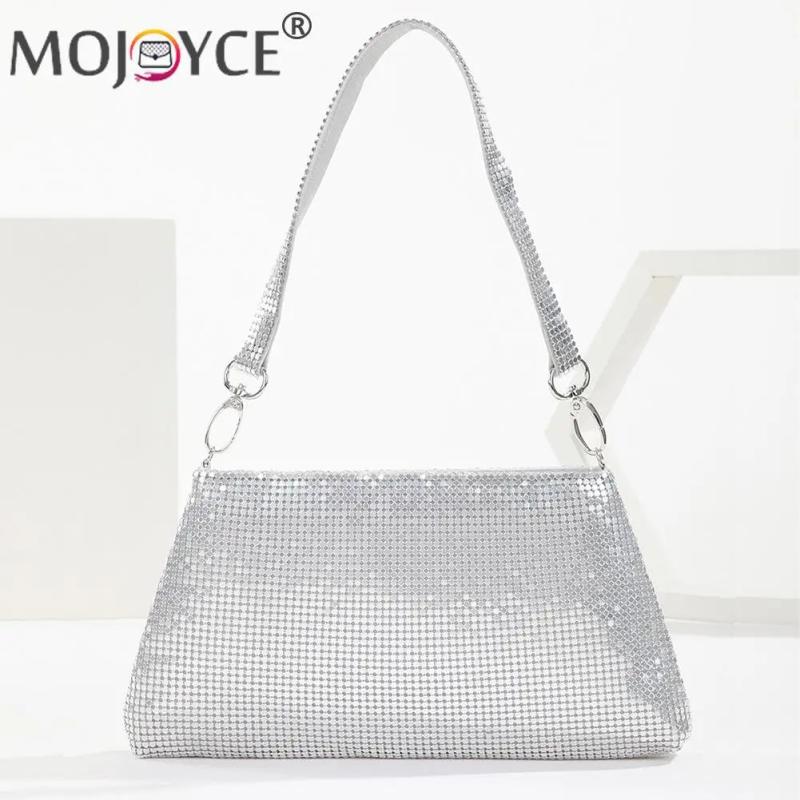 This elegant clutch bag is made of high-quality aluminium with rhinestones pattern, featuring a solid zipper closure. Perfect for evening events and parties.