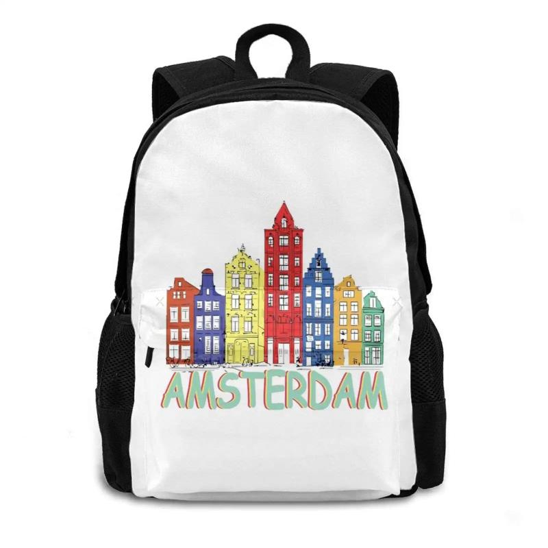 Explore Amsterdam in style with this large capacity backpack featuring iconic Amsterdam art. Perfect for travel or daily use.