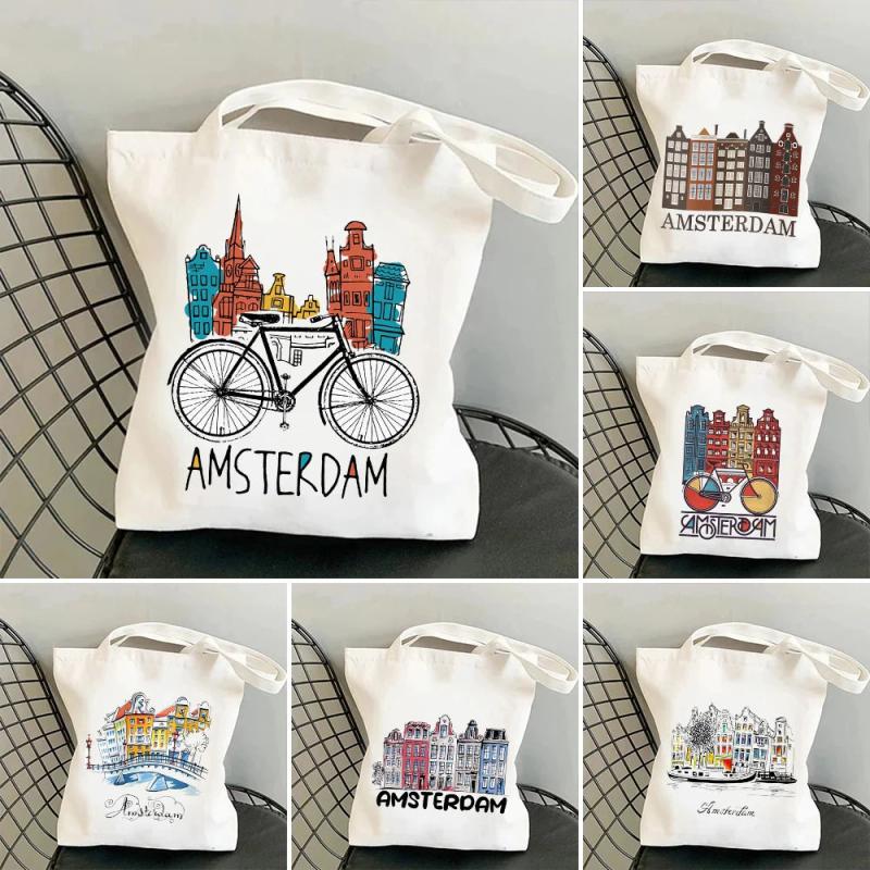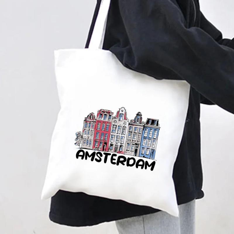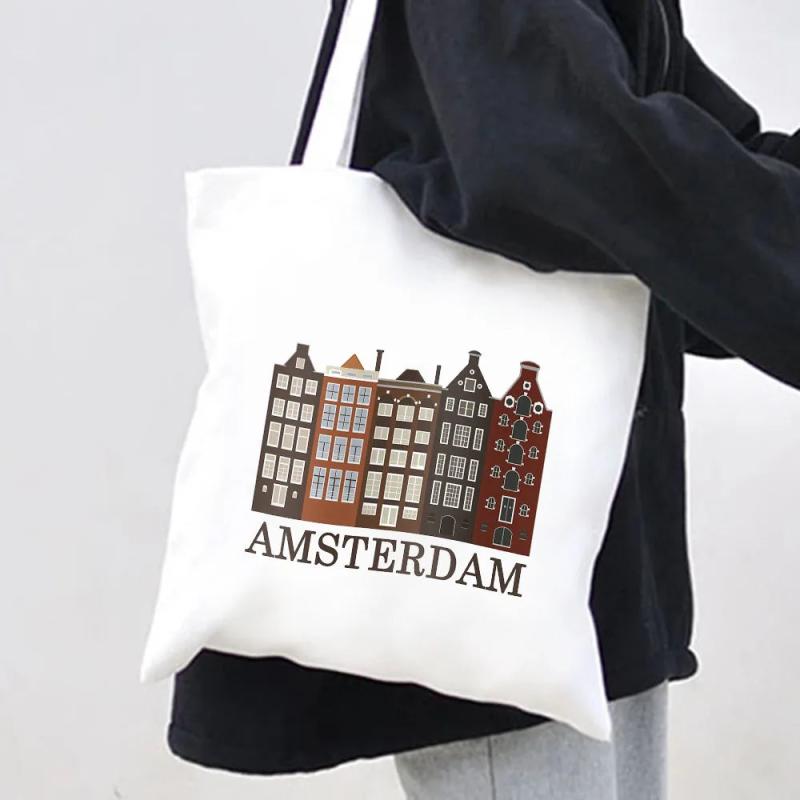 Explore the beauty of Amsterdam with this stylish canvas shoulder bag featuring a city view of the iconic canal and houses in the Netherlands.