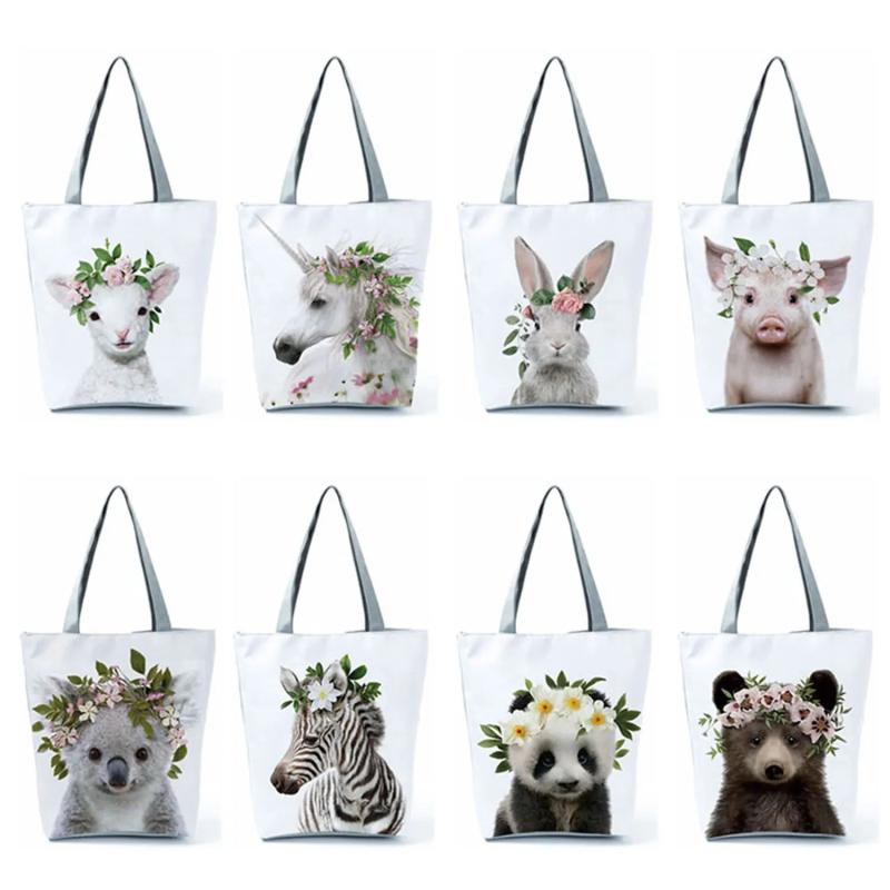Get your hands on these adorable Animal Floral Series Print Women Handbags. Featuring a cute panda, koala, and elephant design, these foldable casual tote bags are perfect for shopping and everyday use.