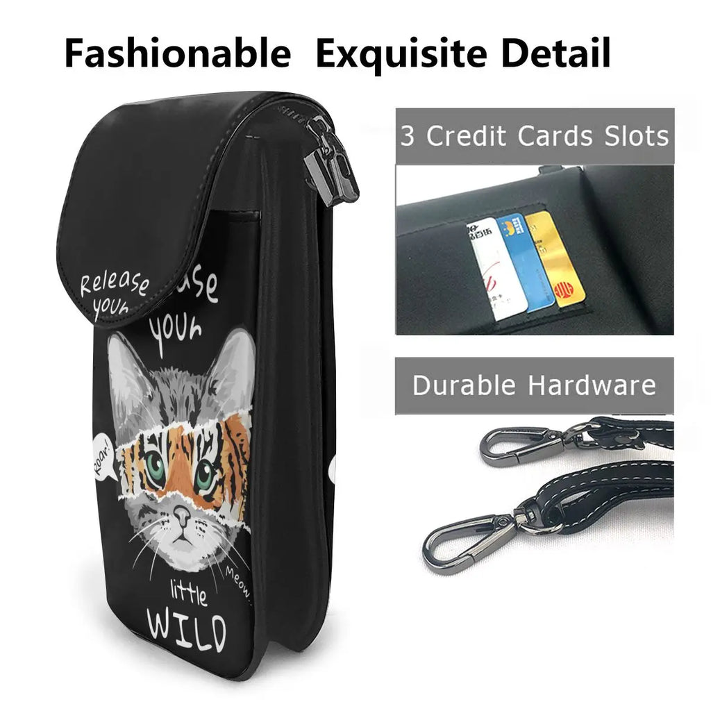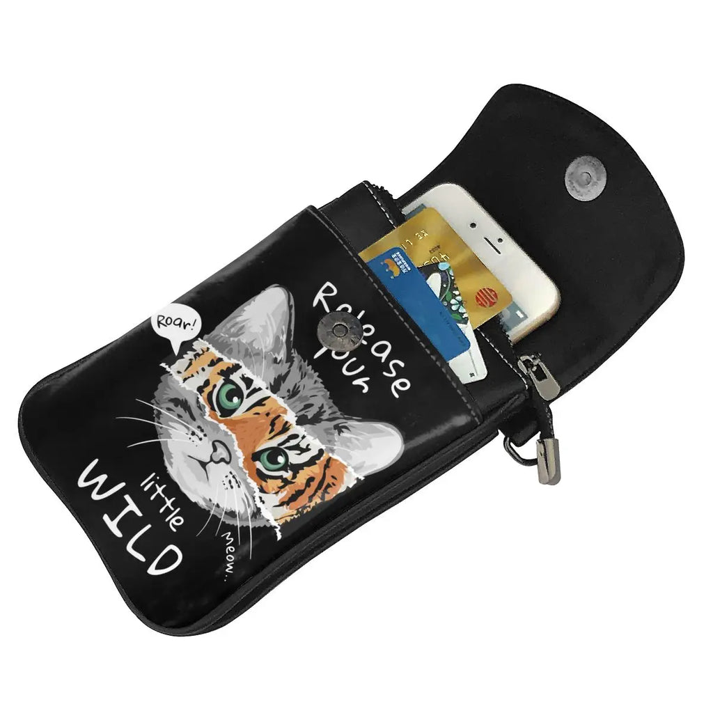 Stay stylish with this PU leather shoulder bag featuring an adorable catty print design. Perfect for carrying your phone and other essentials on the go.