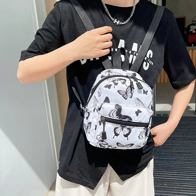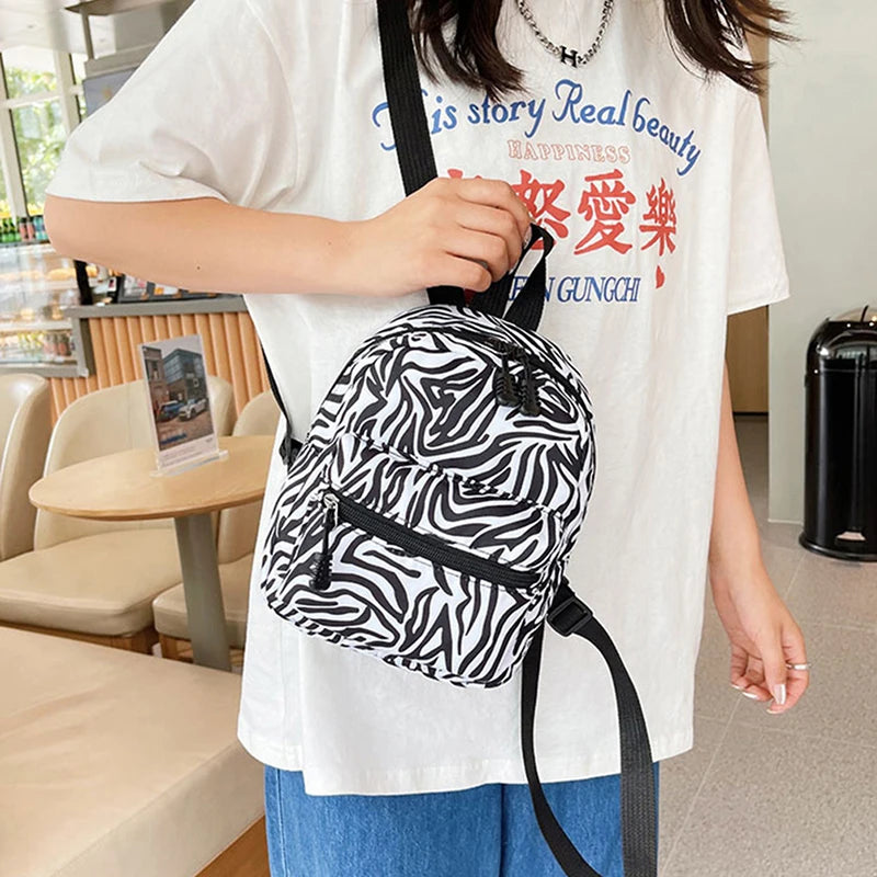 This nylon female bag featuring animal printing is perfect for teen girls. It's a small and stylish backpack ideal for school or casual use.