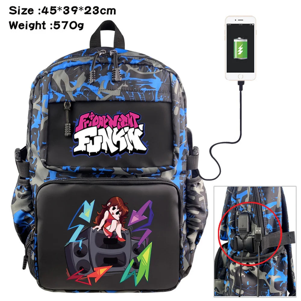 This casual backpack features a fun Friday Night Funkin anime design. It is made of durable nylon and includes a USB port for convenient charging on the go.