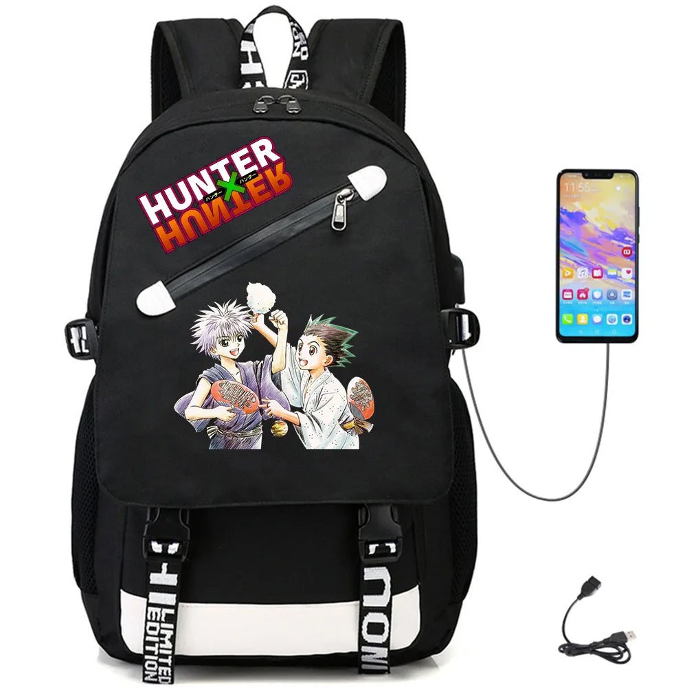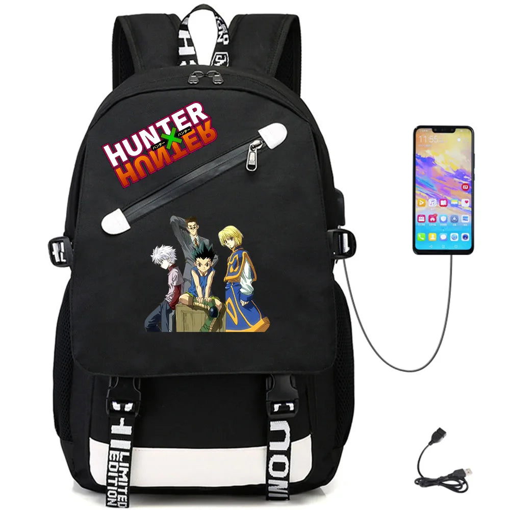This teenager student fabric backpack features a unique design inspired by Hunter Hunter anime series. It includes a USB charging port for convenience.