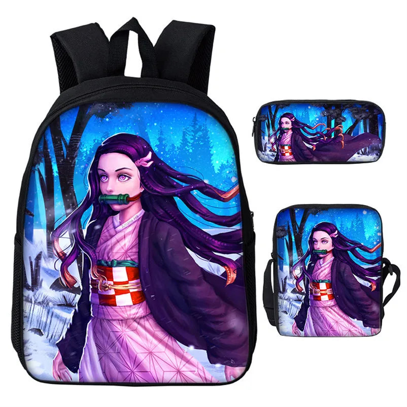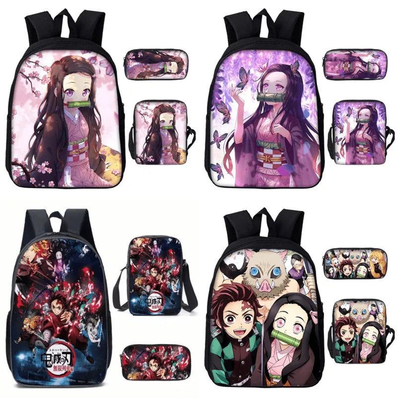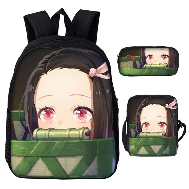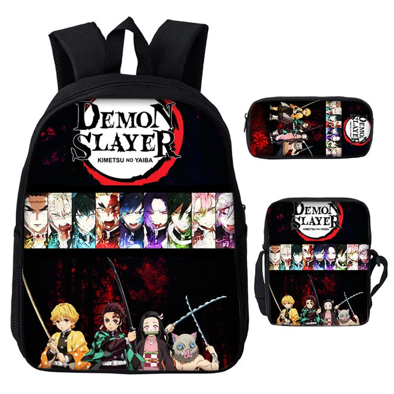 This three-piece school bag set features characters from the popular anime, Kimetsu No Yaiba. Includes a backpack, satchel, and pen bag.