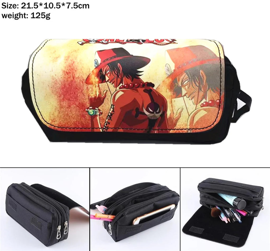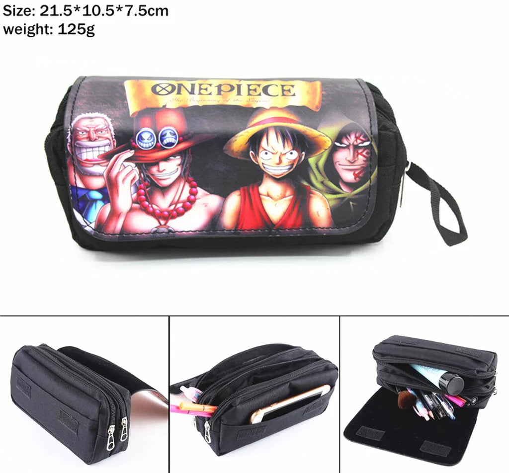 This canvas pencil case featuring Anime characters Luffy and Law is perfect for students and travelers. It can also be used as a makeup bag or stationery bag with a zipper closure.