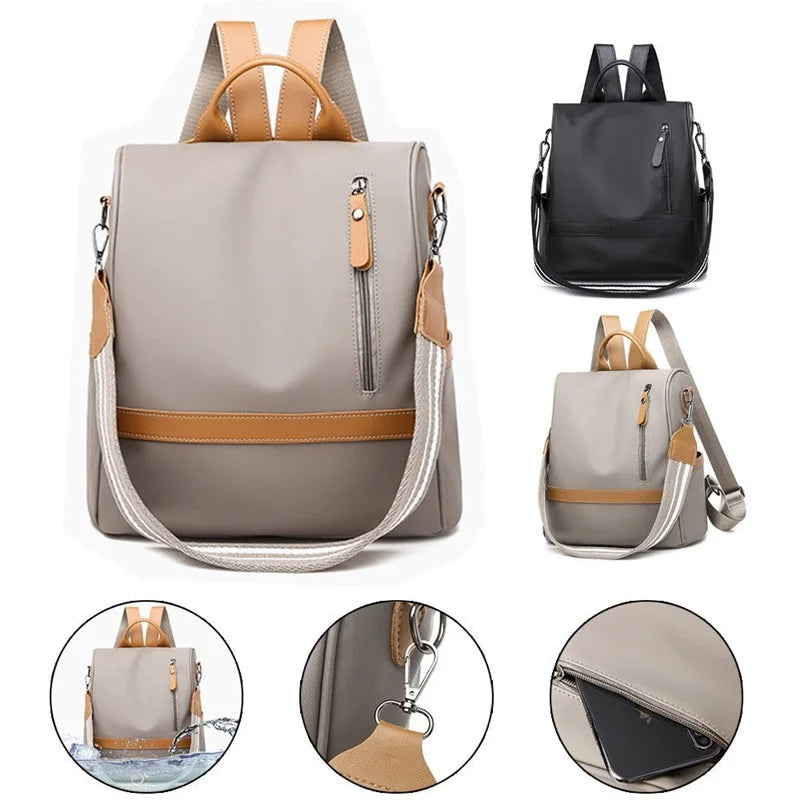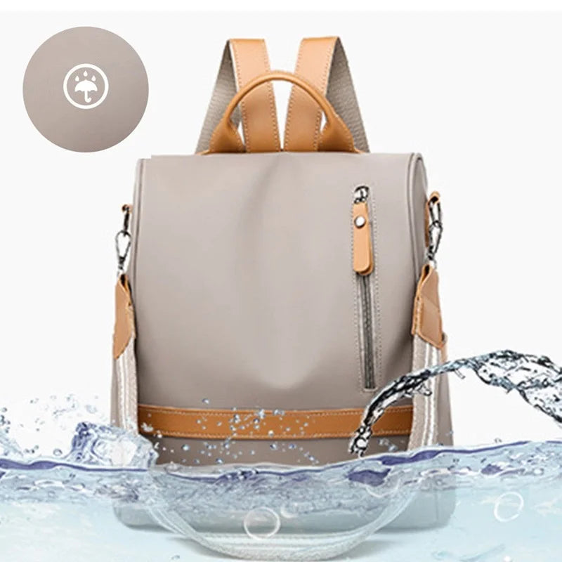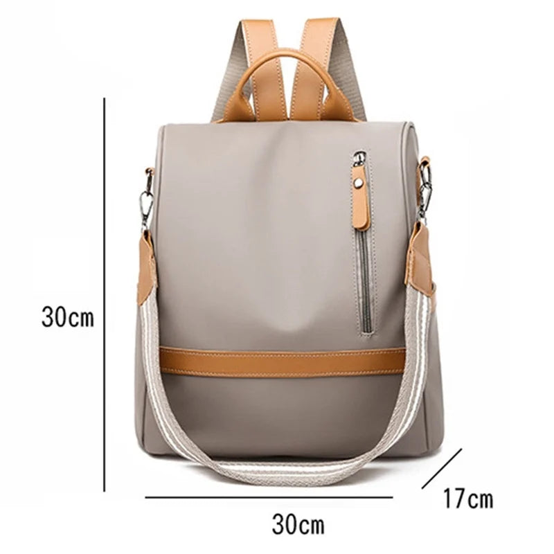 This travel bag is designed for women with anti-theft features and waterproof material. It serves as a multi-functional backpack suitable for students and school activities.
